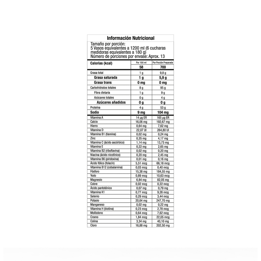 - Porción completa (180 g = 6 cucharadas medidoras): disolver en 5 vasos (1200 ml) de agua.