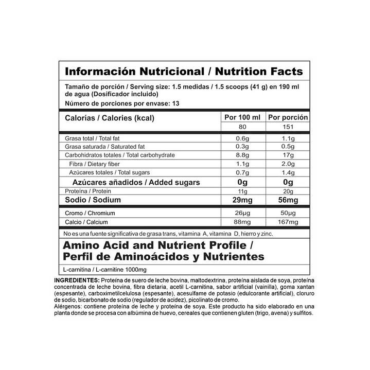 - 20 g de proteína completa por porción, provenientes de 3 fuentes (suero, leche y soya)